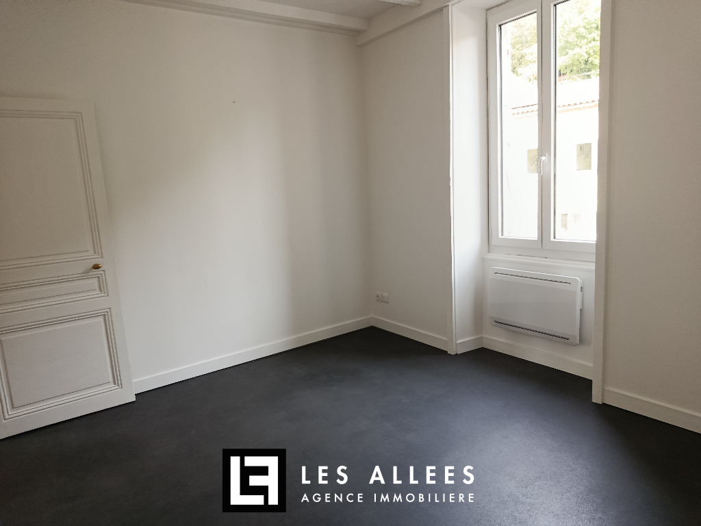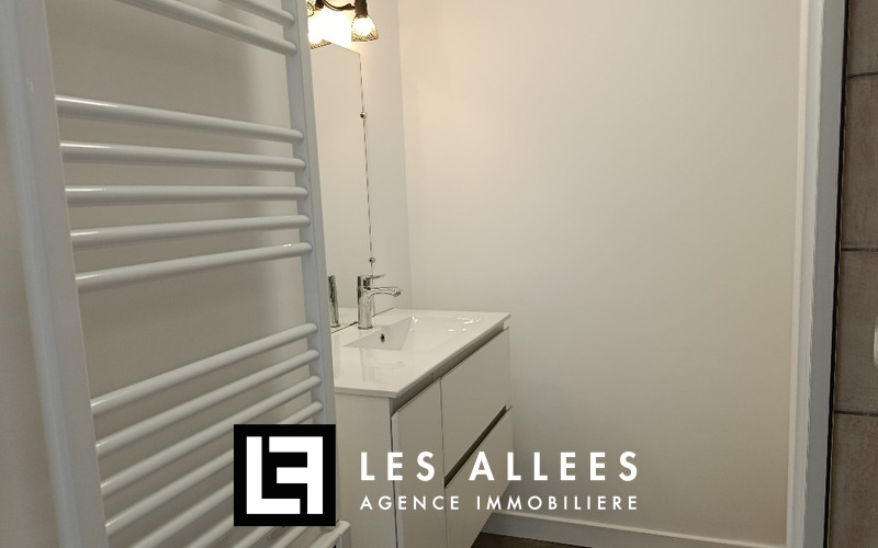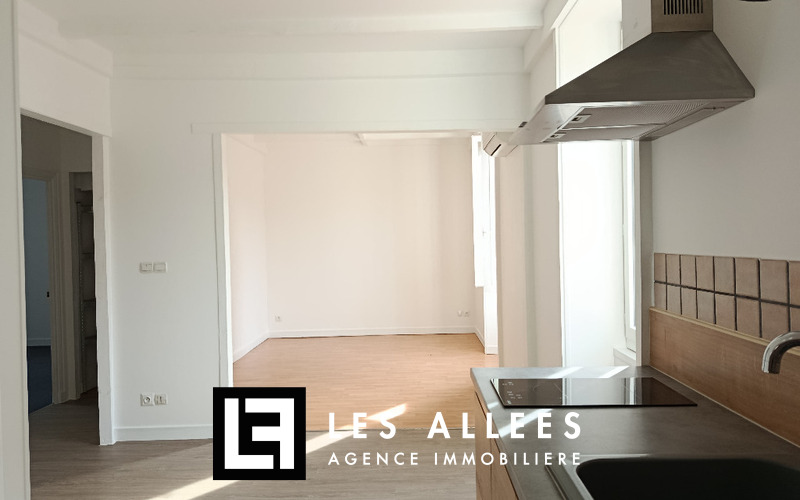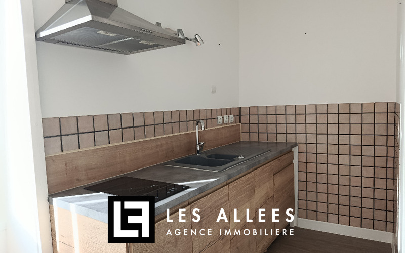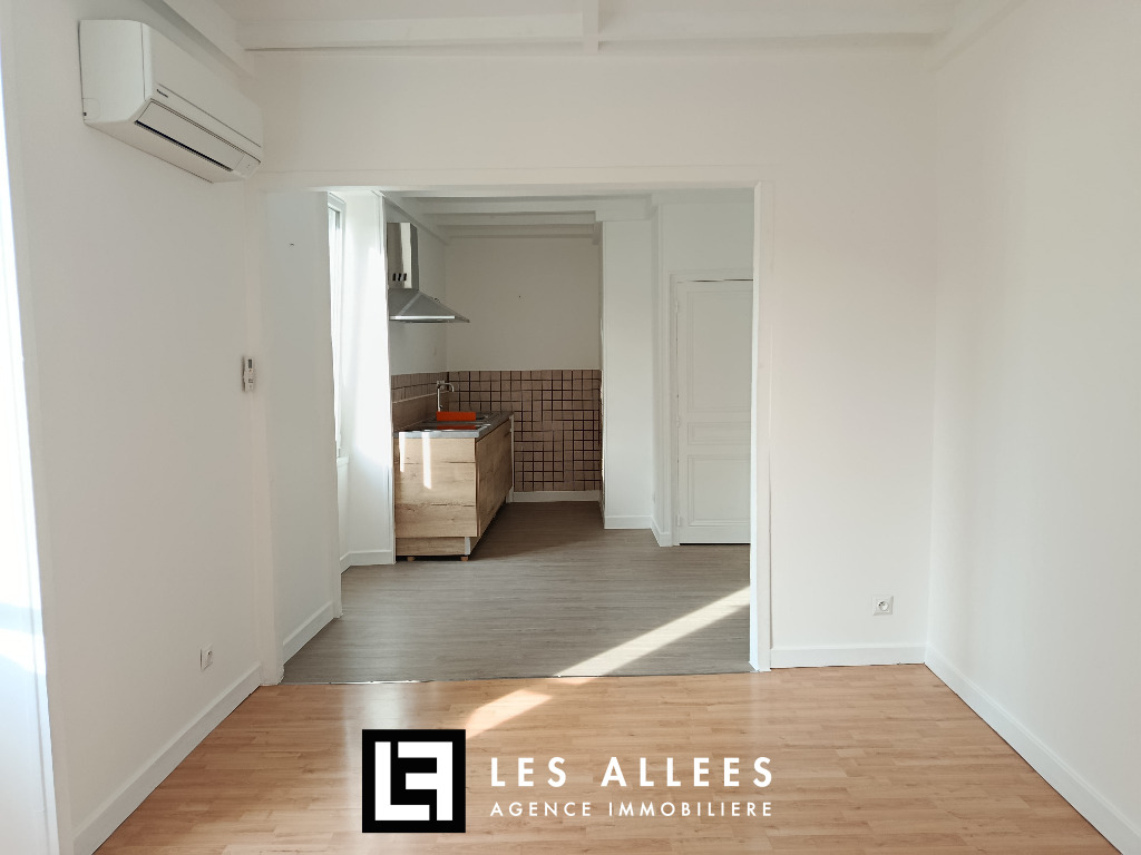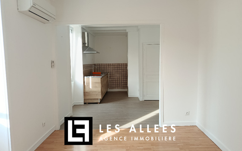 Appartement T2 au premier étage sans ascenseur d'un petit immeuble, proche des commodités, comprenant une pièce principale avec coin cuisine aménagée et équipée (meubles bas, hotte, plaque à induction 2 feux), une salle d'eau, une chambre, un grand cagibi.