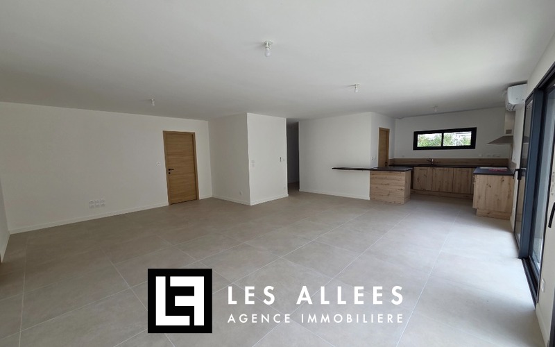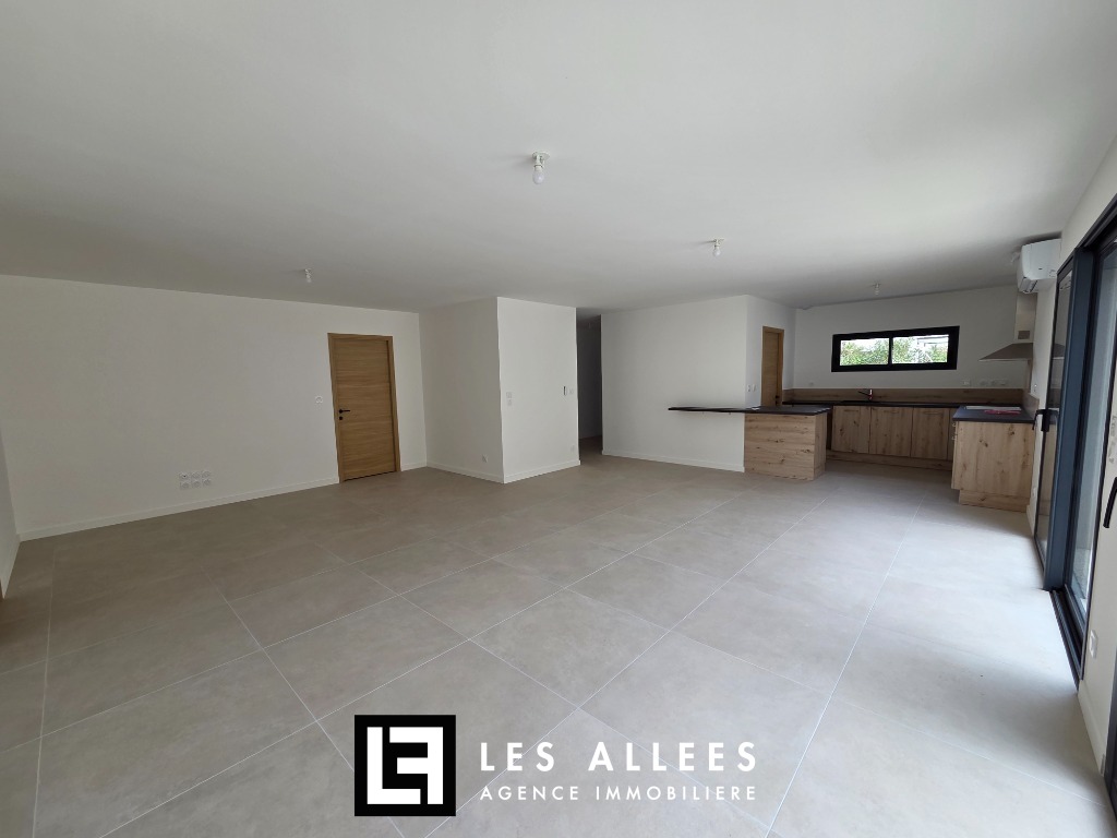Maison de 124 m² composée d'un grand séjour de 50m² avec cuisine ouverte aménagée, 4 chambres dont une suite parentale, salle d'eau, buanderie, garage.