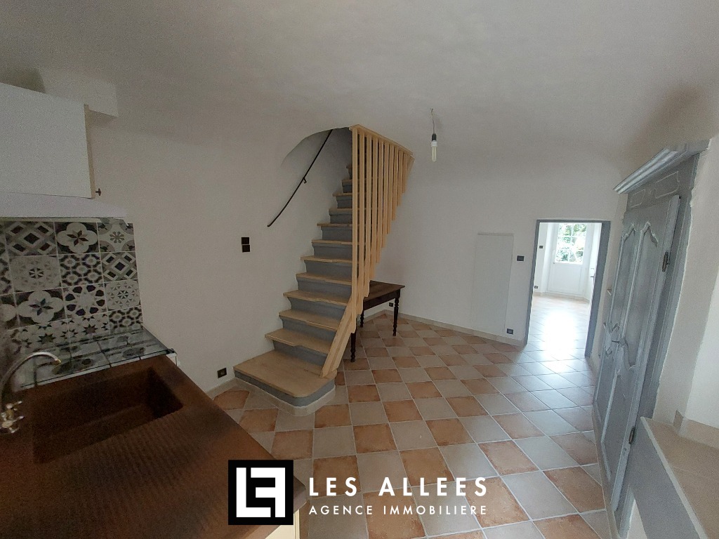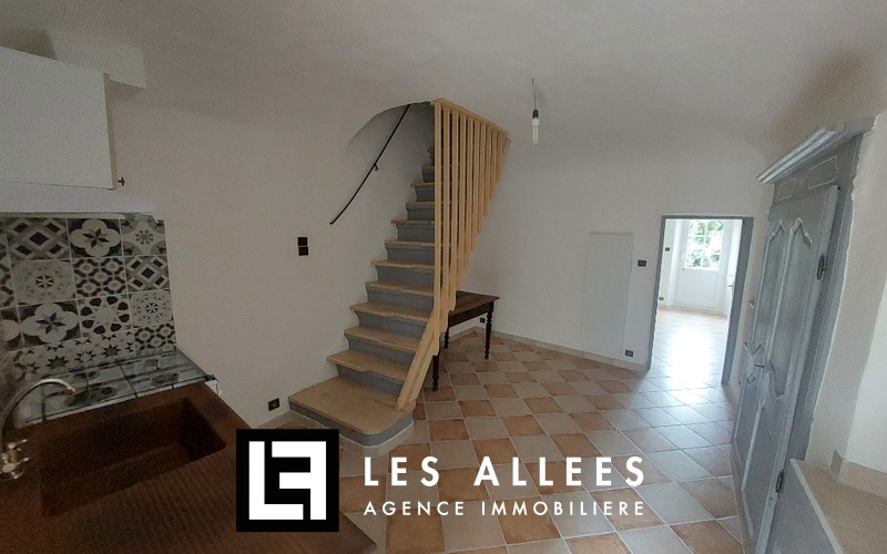 La maison comprend une cuisine séparée, aménagée et équipée (meubles hauts et bas, hotte, gazinière 4 feux + four, table) et un séjour avec cheminée décorative donnant sur un petit extérieur.