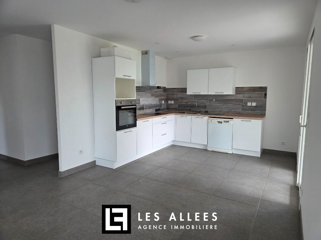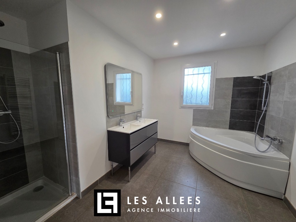 Au sud de la ville, maison récente de plain pied d'environ 123 m² habitables composée d'un grand séjour de 47 m² avec cuisine équipée (plaque, four, hotte), 3 chambres, une grande salle de bains avec baignoire et douche, wc, cellier-buanderie.