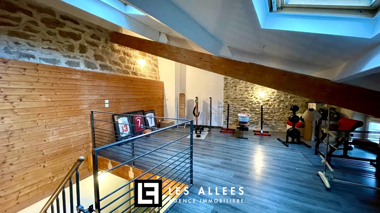 Bel espace de vie composé d’un grand salon et d’une salle à manger ouverte sur une cuisine équipée.