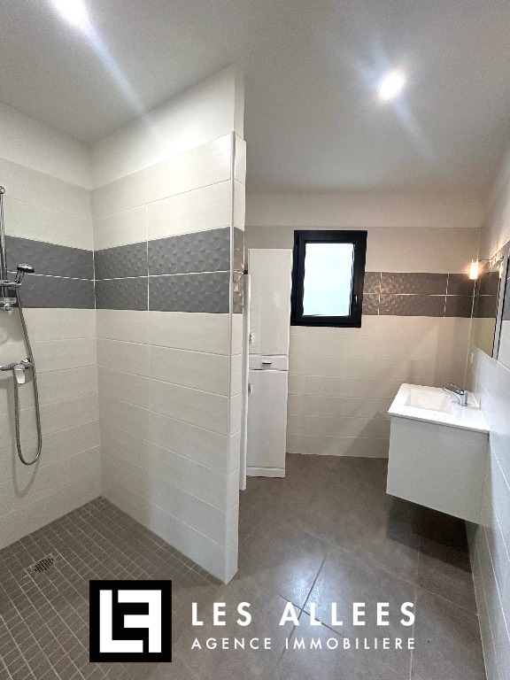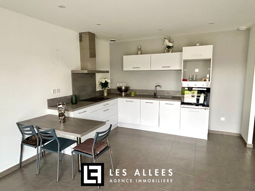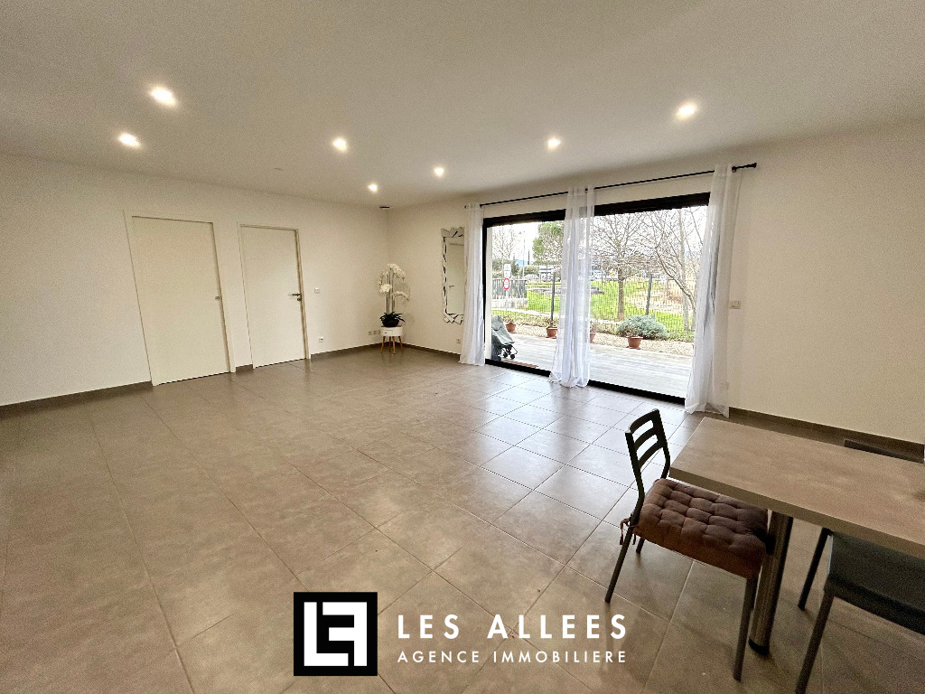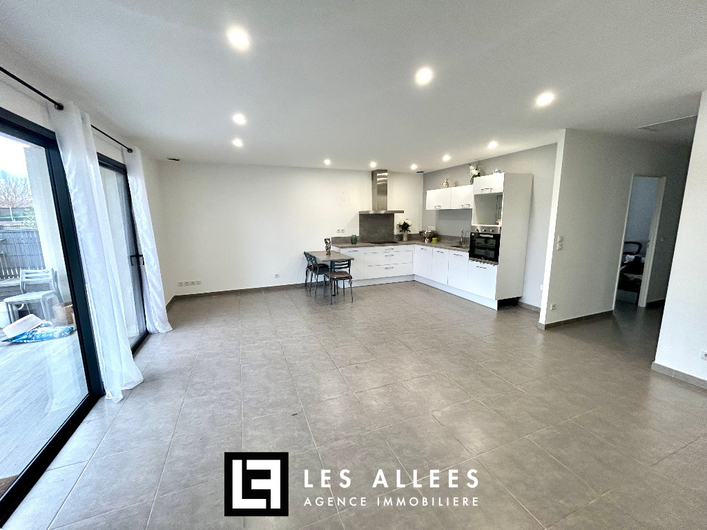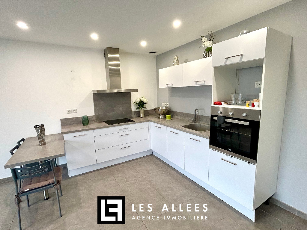Un hall d’entrée qui dessert une vaste cuisine aménagée et équipée, ouverte sur une pièce à vivre lumineuse de 39 m², ainsi qu’une pièce faisant office de buanderie-cellier.