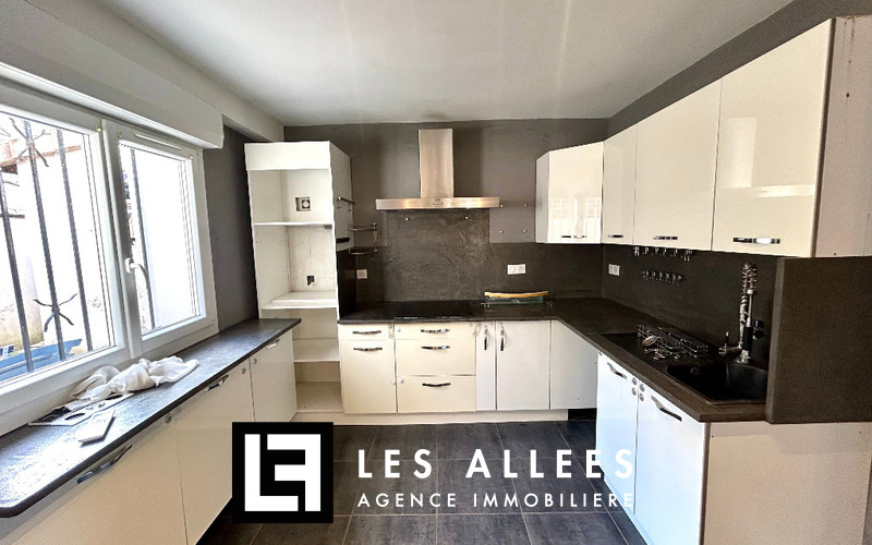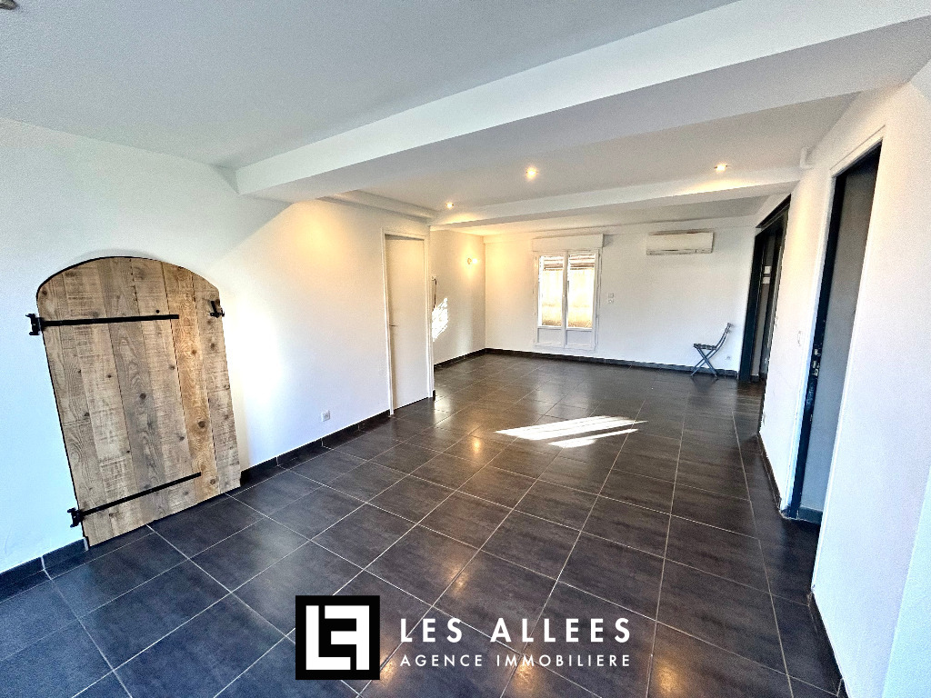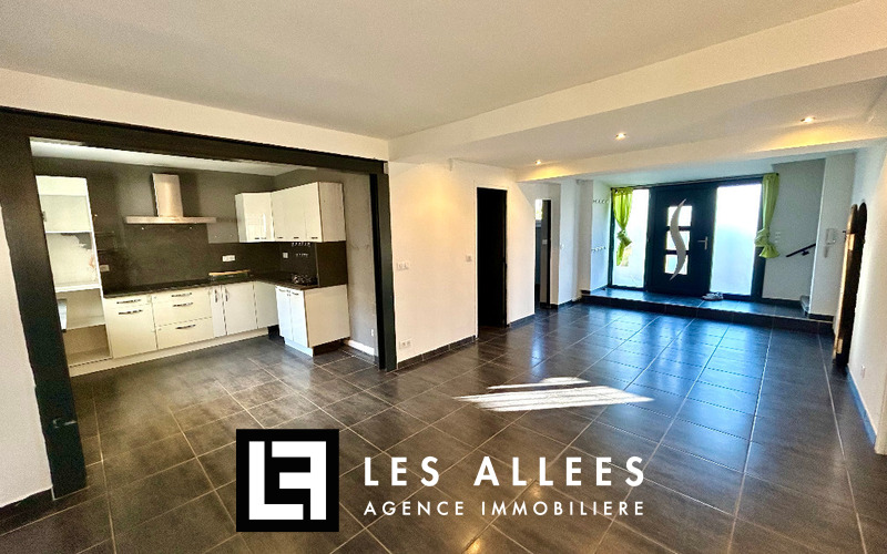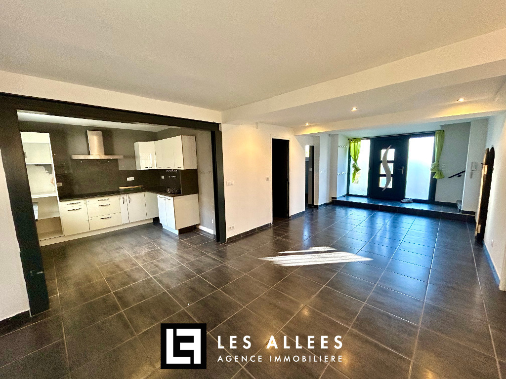Au RDC, une grande pièce à vivre climatisée avec une cuisine équipée et ouverte ainsi qu'un bureau et un W.C.