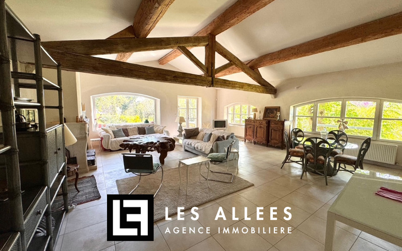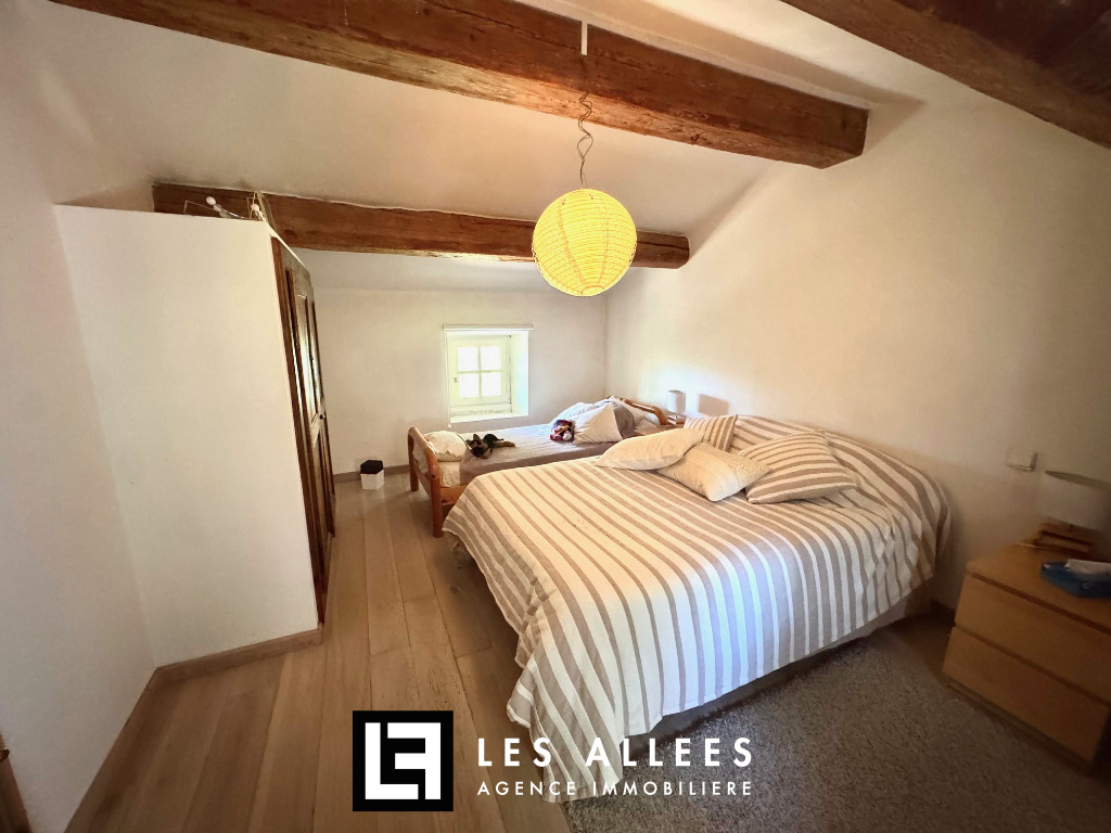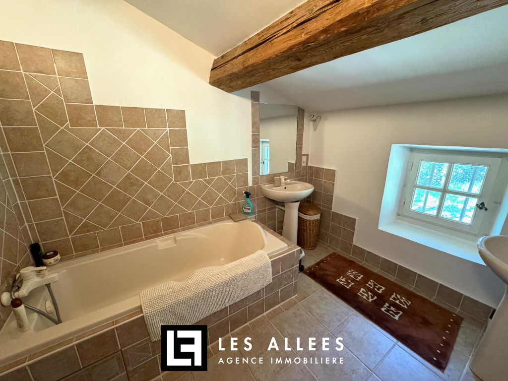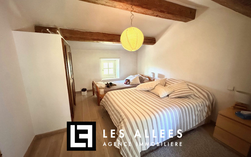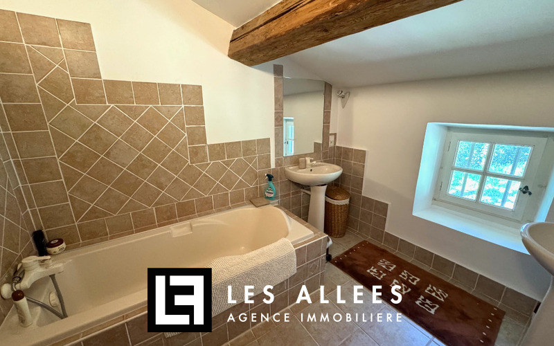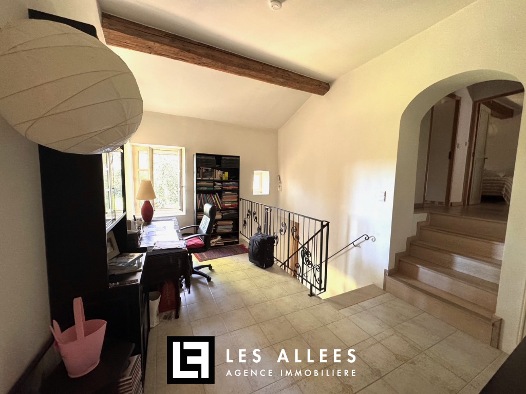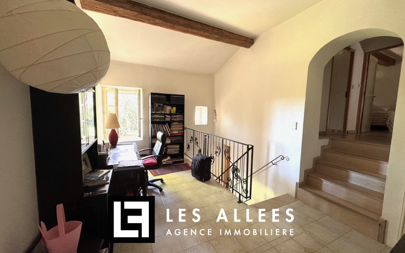 A l'étage, une magnifique pièce de vie avec poutre apparente et accès direct sur une grande terrasse, un grand salon, une cuisine entièrement équipée, un cellier, un WC indépendant et une chambre parentale avec sa propre salle de bain.