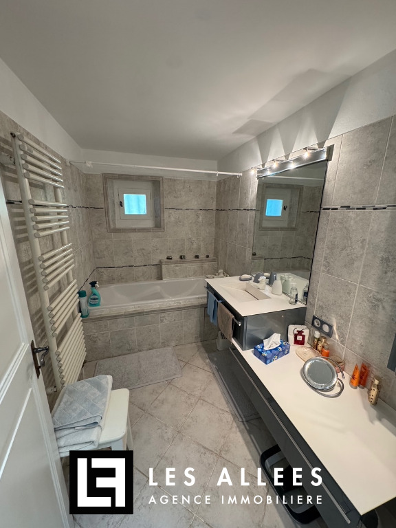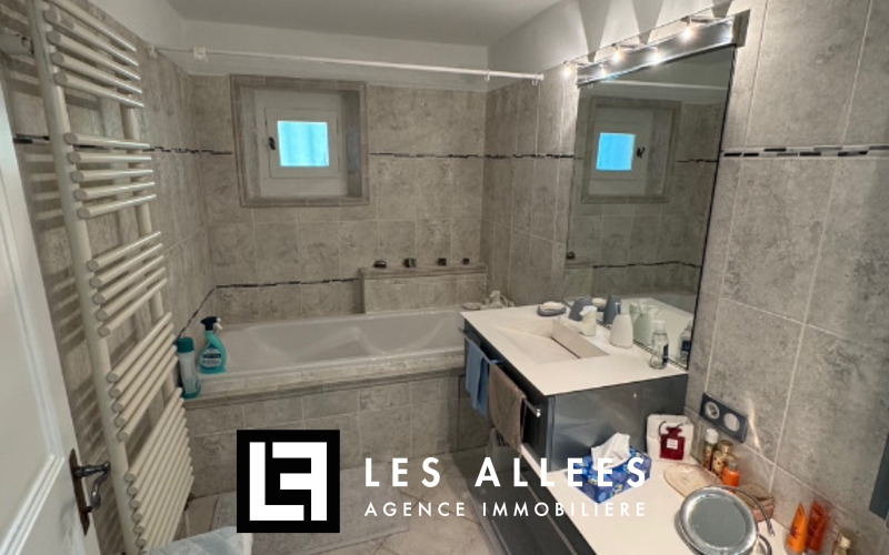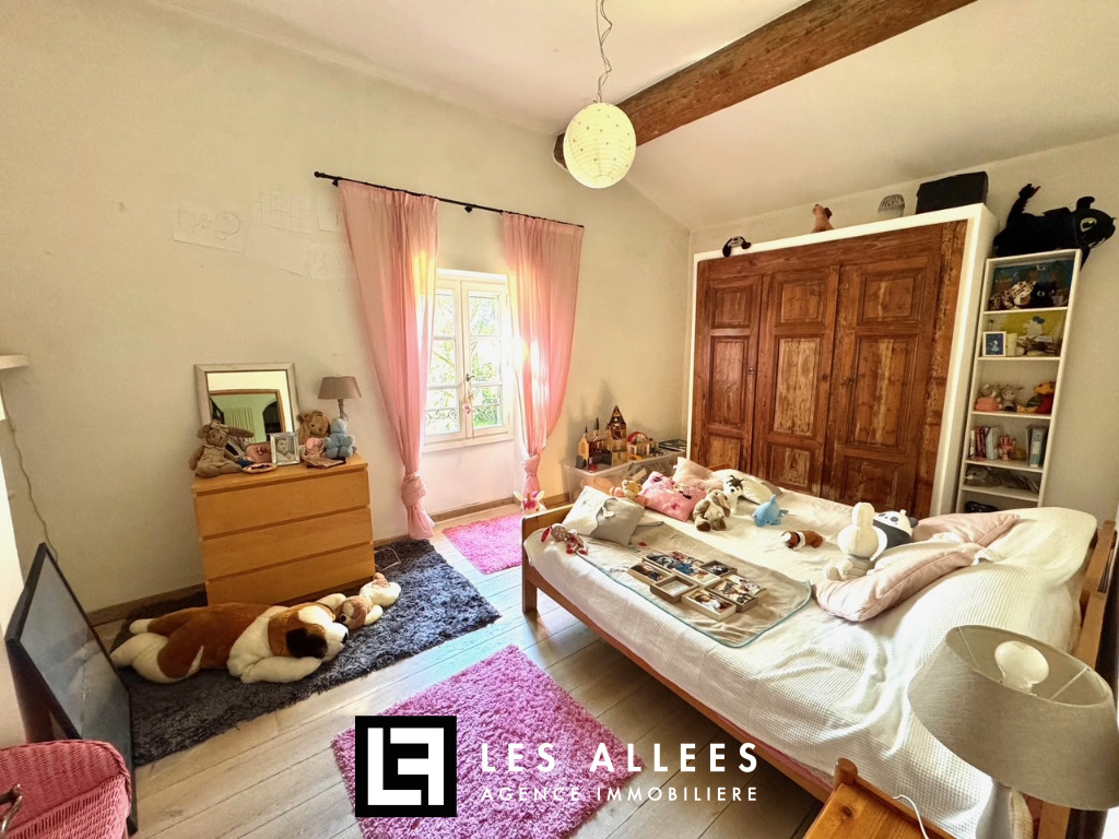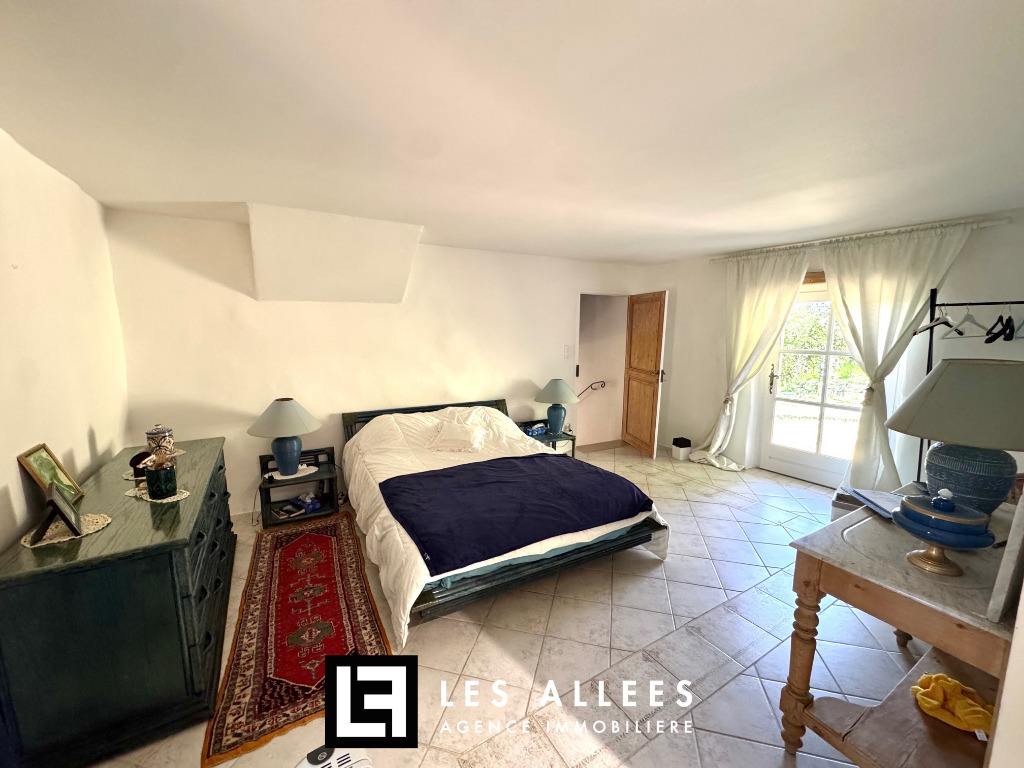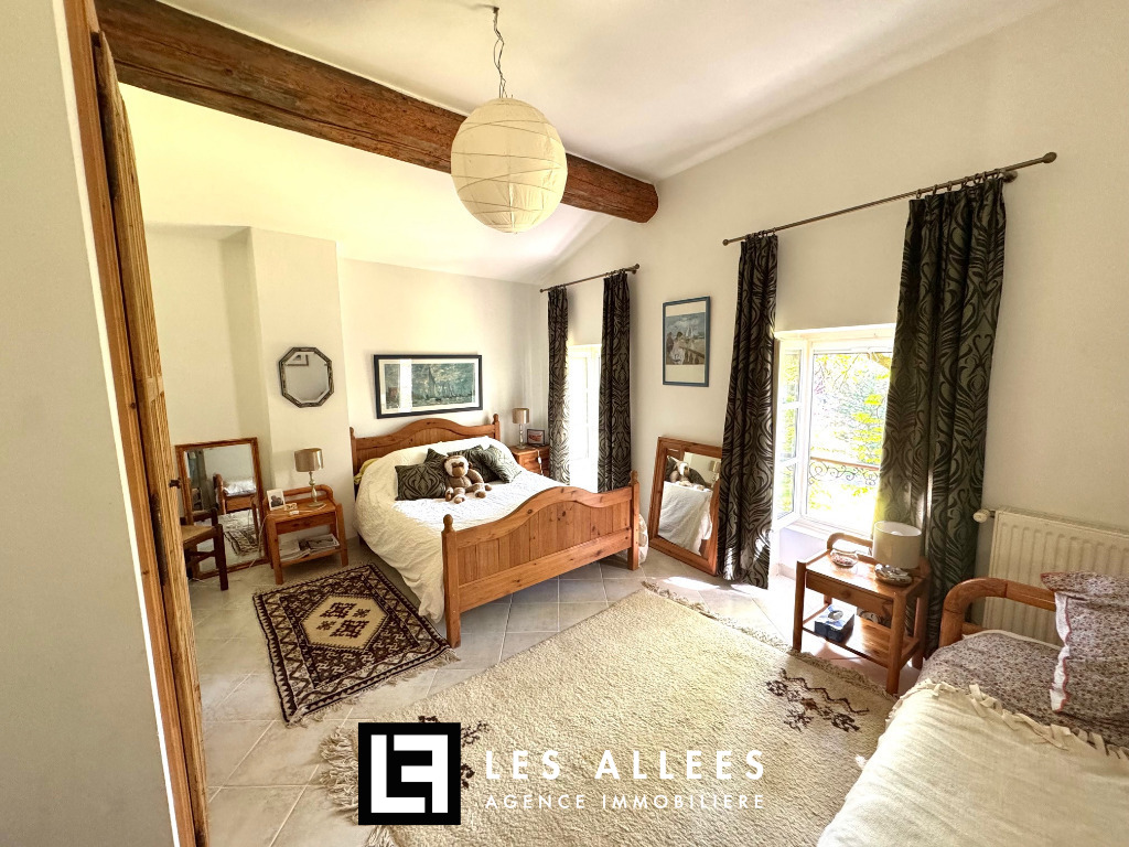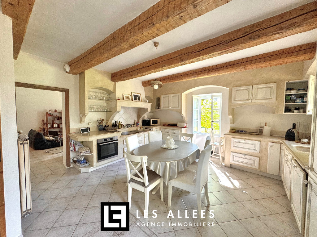 A l'étage, une magnifique pièce de vie avec poutre apparente et accès direct sur une grande terrasse, un grand salon, une cuisine entièrement équipée, un cellier, un WC indépendant et une chambre parentale avec sa propre salle de bain.