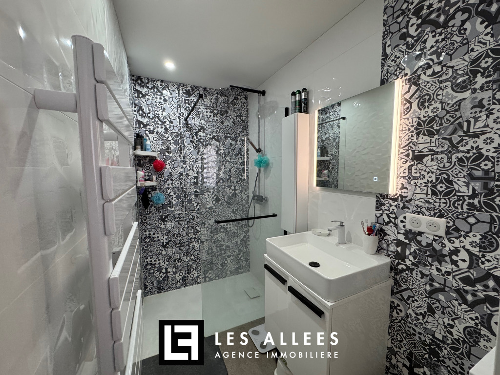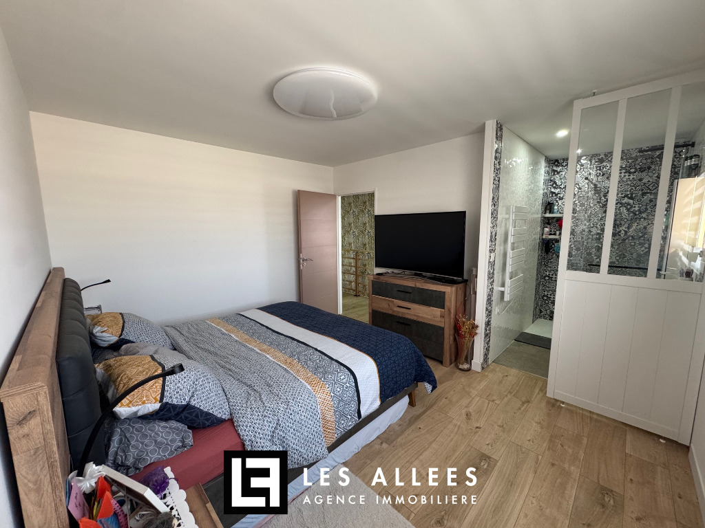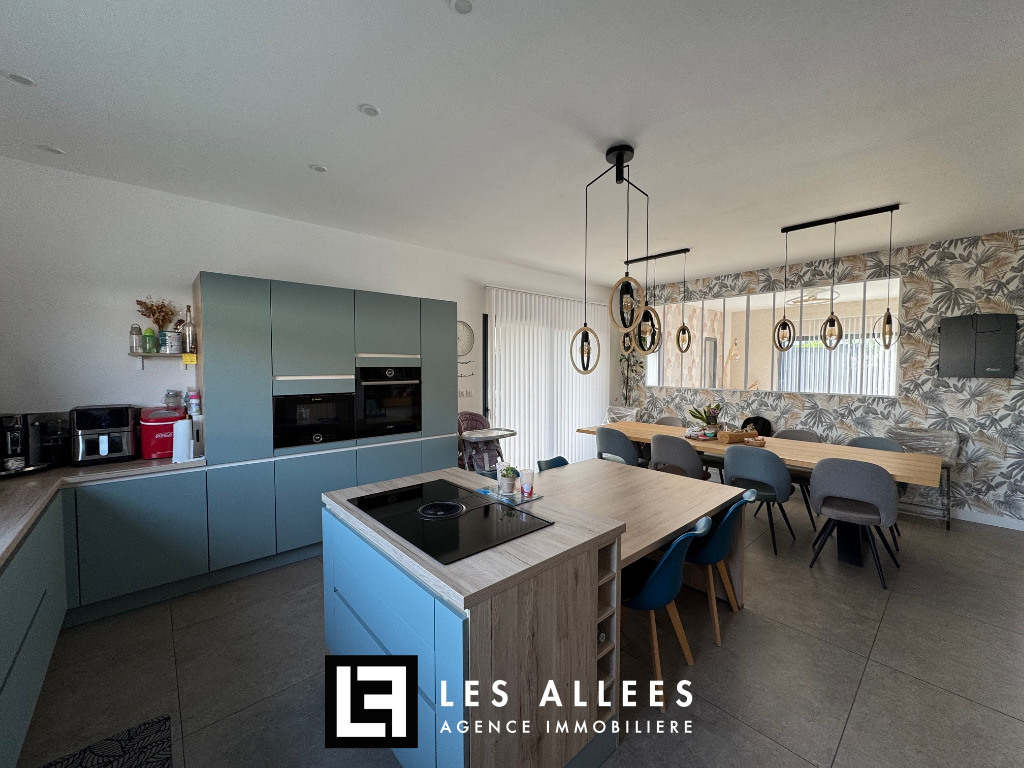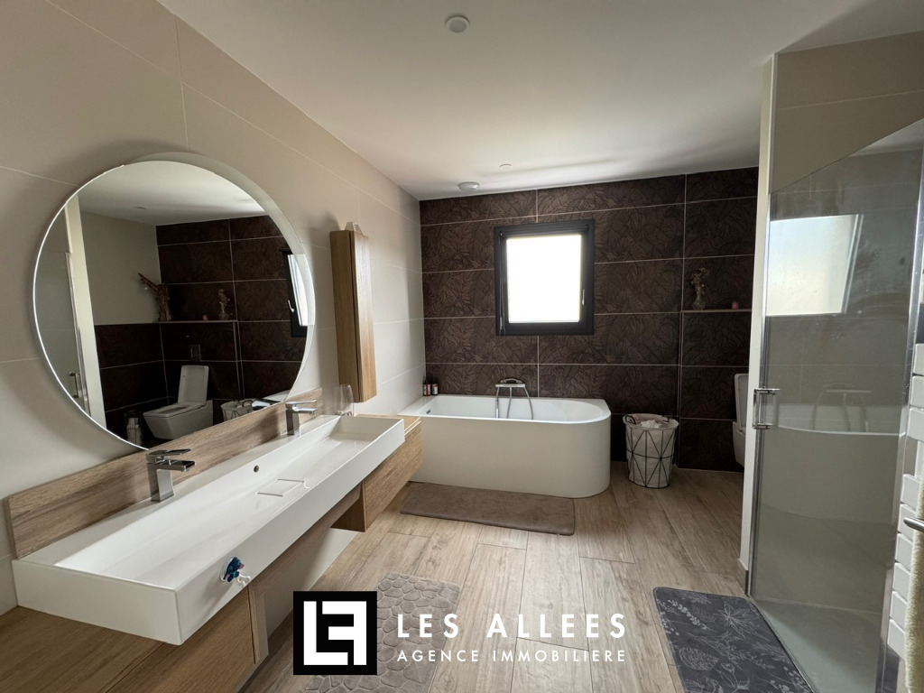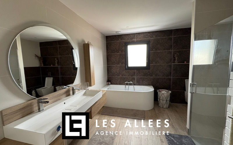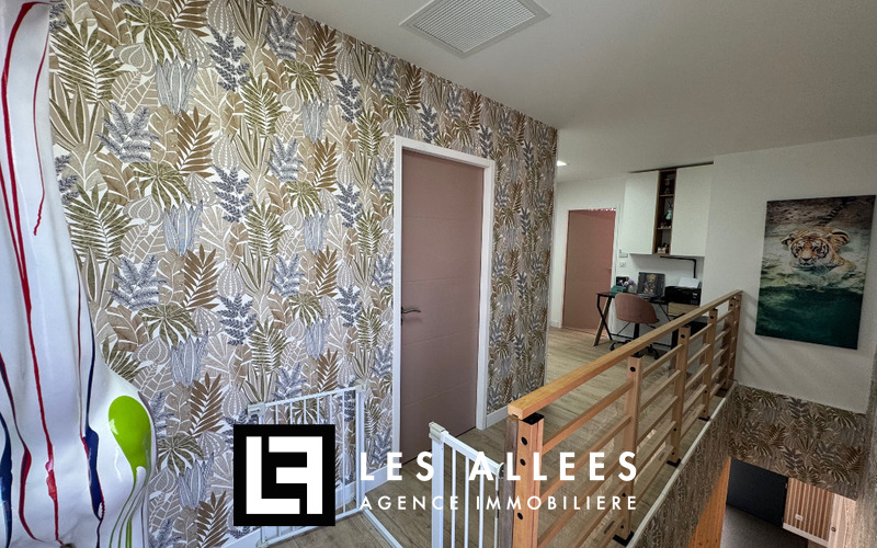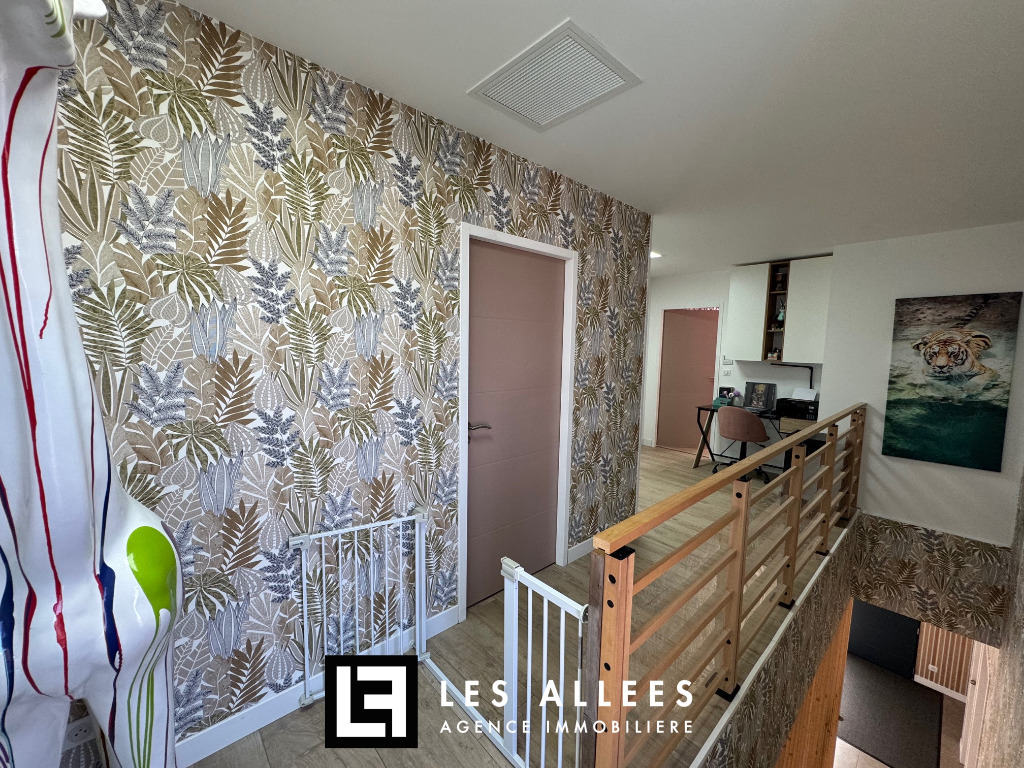 A l'étage, une suite parentale avec dressing et salle de bain, deux chambres, une salle de bain avec WC et un espace bureau pour un total de 180 m² habitable.