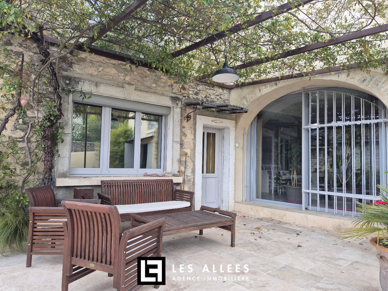 Joli jardin paysagé, avec terrasse couverte, arboré et clos pour des moments de détente.