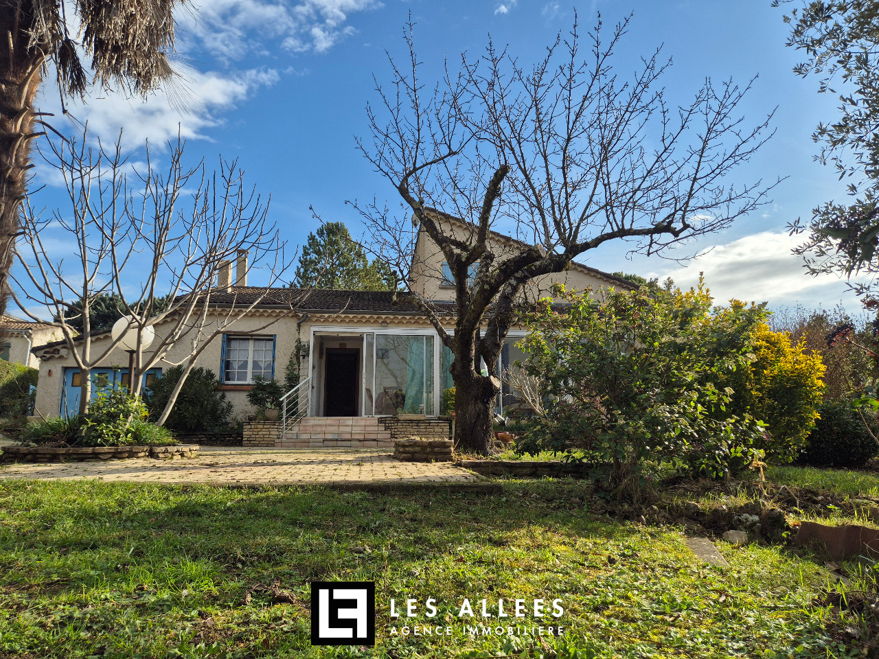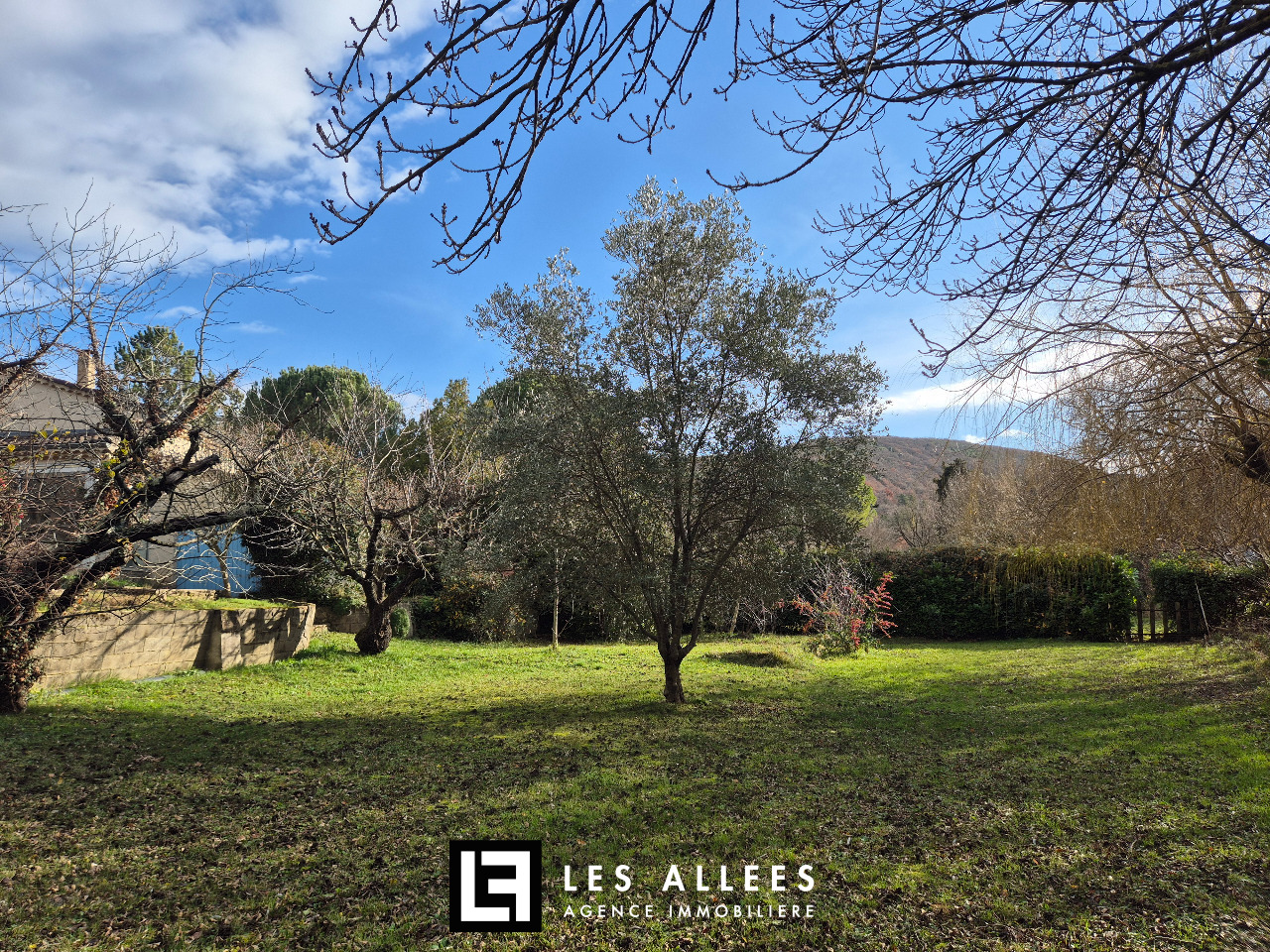 Belle espace terrasse devant arboré et clos.